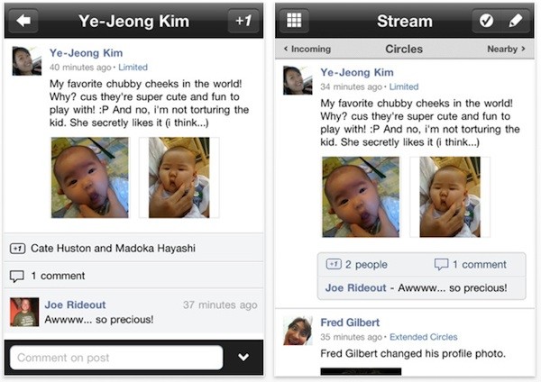 Google-მა შეასრულა დაპირება და iPhone-ის მომხმარებლებისთვის გამოუშვა Google+ ის მობილური აპლიკაცია. მოულოდნელი არ იყო ის, რომ ის ძალიან ჰგავს ანდროიდის ვერსიას, სადაც მოთავსებულია მთავარი სტრიმი და ახლო მომხმარებლები, გაზიარება წერეებში და Huddle ჰენგაუთების მხარდაჭერა. ეს არ არის უნივერსალური პროგრამა, რაც ნიშნავს რომ iPad-ის მომხმარებლებს მოუწევთ ვებ აპლიკაციით სარგებლობა. იგივე შეიძლება iPod touch-ის ვერსიაზეც.