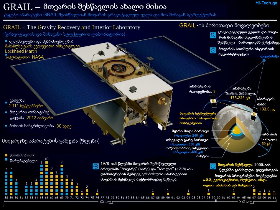 GRAIL- THE Gravity Recovery and Interior Laboratory, მთვარის მისიაში მონაწილეობს ორი “ტყუპი” აპარატი, რომელთა დანიშნულებაც, დედამიწის თანამგზავრის გრავიტაციული ველის და მისი შინაგანი მდგომარეობის შესწავლაა. აპარატებები 8 სექტემბერს გაეშვა მისე კანავერალის კოსმოდრომიდან. მთვარემდე მისაღწევად, ორ აპარატს დასჭირდება დაახლოებით ოთხი თვე, ისინი მოძრაობენ სპეციალური ტრაექტორიით, რომელიც მათ დაუზოგავს ენერგიას.