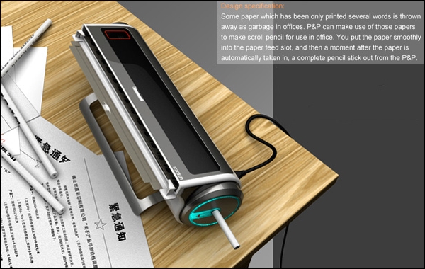 ტაივანელმა დიზაინერებმა ახალი გამოყენებეა მოუძებნეს ოფისის ქაღალდებს, რომელიც ტონობით იყრება სანაგვე ყუთში. საქმე ძალიან მარტივადაა, თქვენ შეგიძლიათ აიღოთ თქვენთვის უკვე არასაჭირო ქაღალდები და ჩადოთ ის P&P Office Paper Waste Processor-ში და შედეგათ თქვენ მიიღებთ ნაცნობი ასოებით გაფორმებულ ფანქარს… გამოყენებულია Yanko Design-ის მასალები.